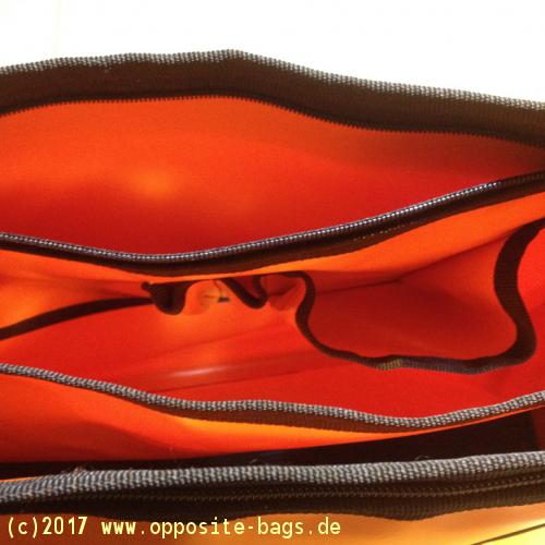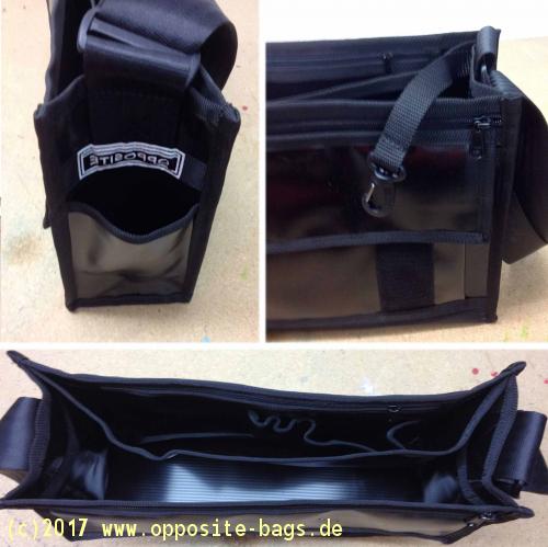 Die Innentasche hat einen Reissverschluss, ein Innenfach A4, ein extra Fach mit Reissverschluss und eines mit Klett vorne. Zusätzlich noch ein Steckfach seitlich. Des Weiteren ein Schlüsselclip und ein Autogurt.